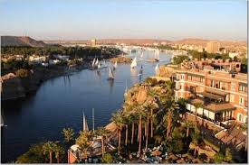 It stands on the east bank of the Nile at the first cataract and is a busy market and tourist center. Its ancient name, Swenet, translates as "trade". It contains the island of Elephantine.